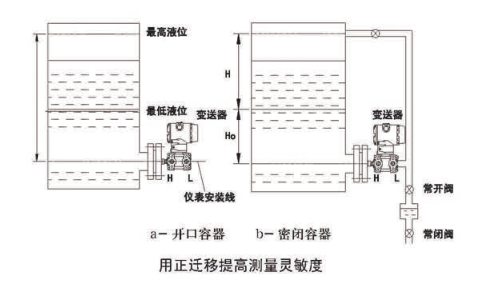 變送器的正遷移適用于敞口或非敞口容器內(nèi)液位的測量。安裝時正壓室連接容器接口,負(fù)壓室與大氣或者低壓側(cè)相通。