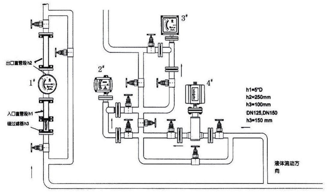 •儀表的上下游管道應與儀表的口徑相同,連接法蘭或螺紋應與儀表的法蘭或螺紋匹配,儀表上游直管長度h應保證是儀表公稱口徑的5倍.下游直管段長度不少于250mm。
